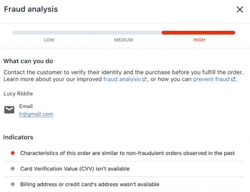 Shopify 商家可以使用其欺诈分析工具。在机器学习算法的支持下,它分析整个网络中的数据以确定订单中的欺诈风险级别,以便企业主可以就是否履行订单做出明智的决定。