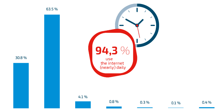 网民在手机上花费大量时间。94.3%的网民每天上网,其中 30.8%的网民每小时上网一次。88.6%的网民通常使用智能手机上网。他们偏爱的应用程序和网站包括 WhatsApp(24%)、Instagram(22.5%)和 Facebook(22.2%)。此外,安全问题也日益受到关注。网络钓鱼等欺诈行为影响着用户的行为。64.9% 的用户在上网时会关注浏览器地址栏中的信息,尤其是包含敏感数据的门户网站,如网上银行。
